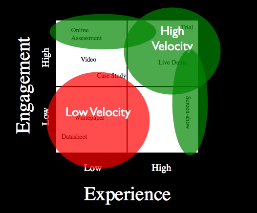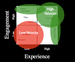 In the upper right we see high velocity programs such as Trials, live demo instances and the like. In the bottom left we see low velocity deliverables such as whitepapers and datasheets. And while there is a role for these low velocity deliverables, high velocity marketing spend will heavily weight high Engagement and high Experience programs and deliverables.